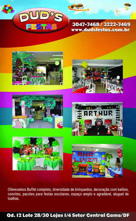15/05/2013 08:52A DUD’S FESTAS é uma empresa especializada em festas infantis com tudo o que é necessário para a realização deste grande sonho. DUD’S FESTAS oferece : Buffet completo, diversos brinquedos , decoração com balões , convites , pacotes para festas escolares , espaços amplos e agradáveis , aluguel de toalhas . Decoramos a festa do seu filho ou filha com todo o carinho e perfeição . A DUD’S FESTAS conta com uma equipe com qualidade, pontualidade e profissionalismo para fazer da festa do seu filho ou filha um grande evento. DUD’S FESTAS realizando sonhos de toda a família !. Para mais informações acesse: https://www.omb100.com
